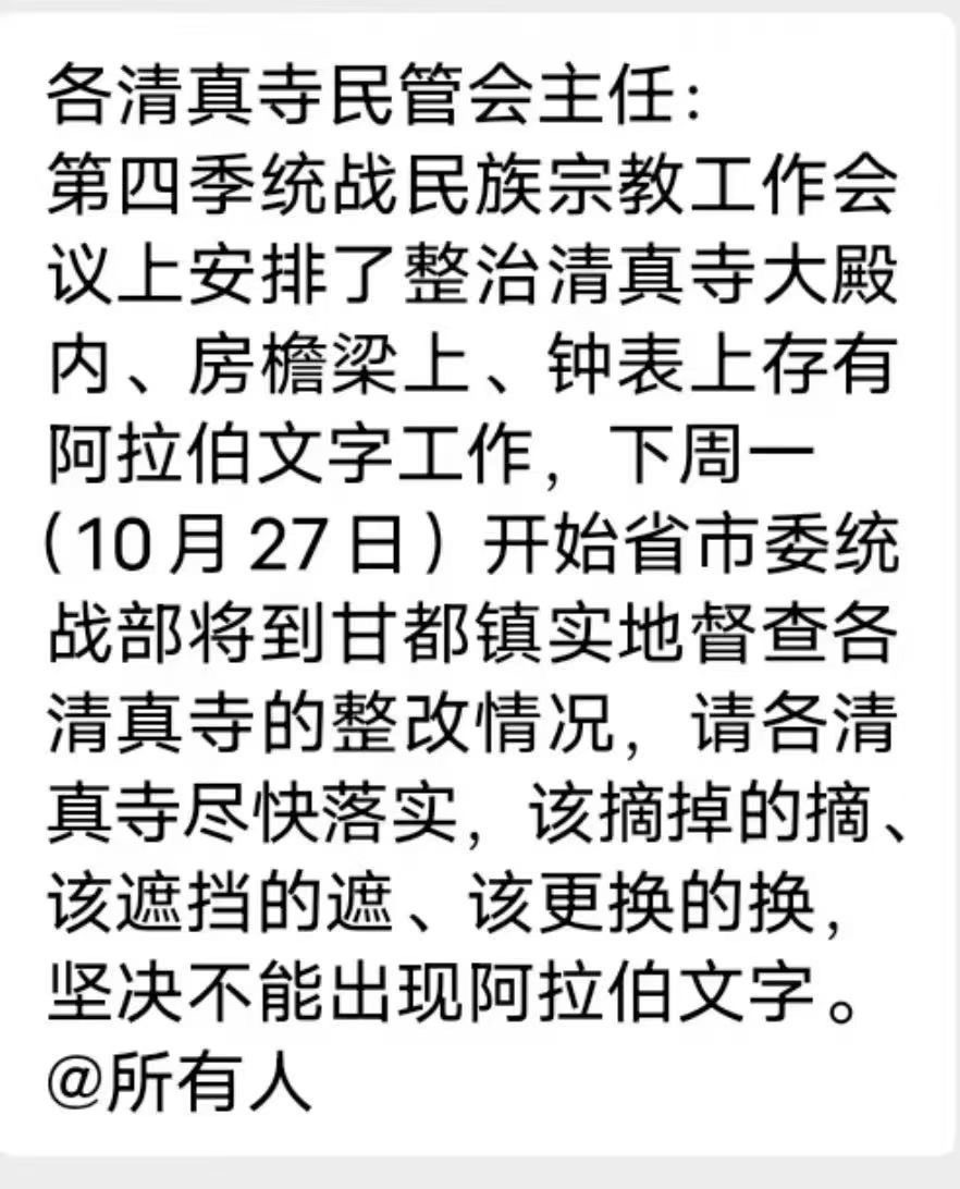 Starting next Monday, October 27th, the United Front Work Departments of the Provincial and Municipal Committees will be conducting on-site supervision in Gandu Town, Qinghai province, China. to check the rectification status of all Mosques.